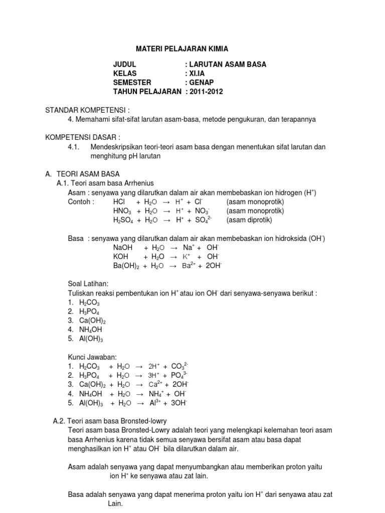 Materi Kimia Asam Basa Kelas Xi Ipa Semester 2 Standar