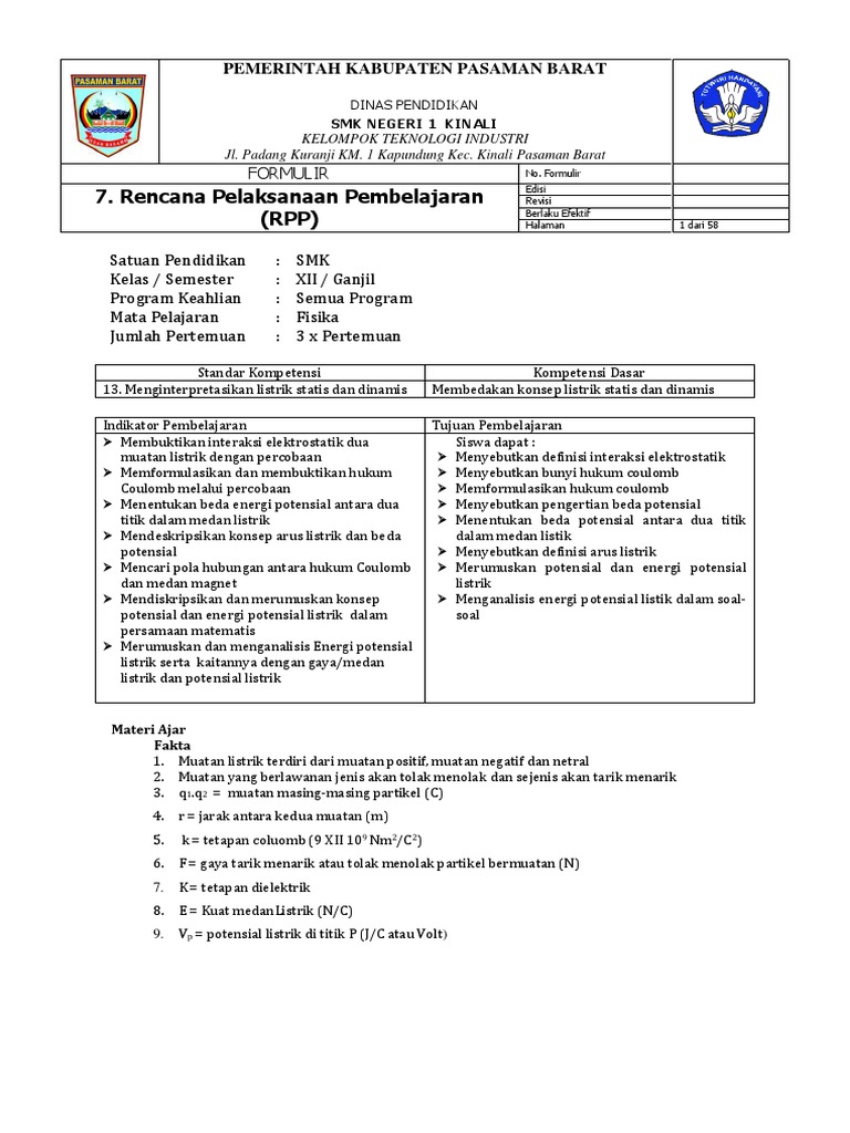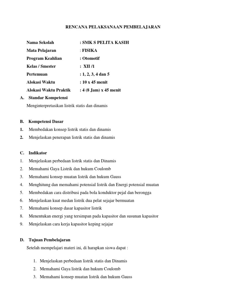 5 Sma Kelas Xii Rpp Kd 3 3 4 3 Listrik Statis Karlina 1308233