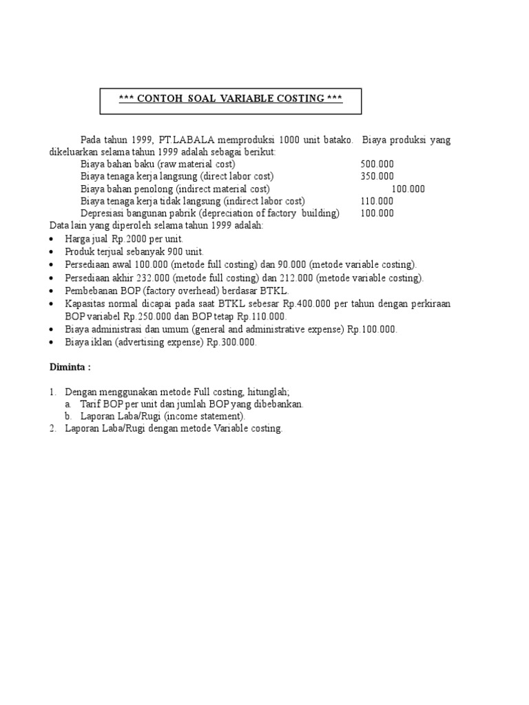 Contoh soal variabel costing dan full costing. Artikel metode full costing dan metode variable costing ini diposting oleh unknown. Contoh file soal uts lengkap kelas 1 6 sdmi semua mata pelajaran 20162017 berikut ini adalah kumpulan dari berbagi sumber tentang contoh soal akuntansi manajemen full costing dan variable costing yang bisa gunakan untuk bank soaldownloadsd dan diunduh secara gratis dengan menekan tombol download biru. Contoh soal dan jawaban menghitung biaya menggunakan metode abc pt.