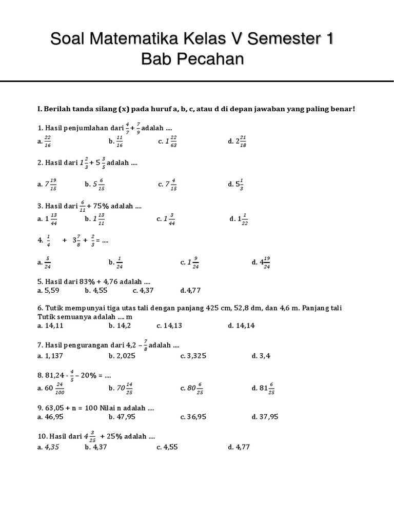 Soal Matematika Kelas 5 Pecahan Dan Kunci Jawaban. Soal pecahan kelas 5 perlu diujikan untuk mengetahui sejauh mana pemahaman siswa setelah diberikan materi. Berilah tanda silang x pada huruf a b c atau d pada jawaban yang benar.